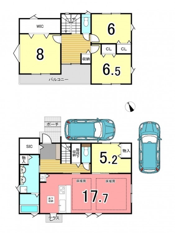 - 側溝、ウォークインクローゼット、駐車場2台分、シューズインクローゼット/室内干しスペース
