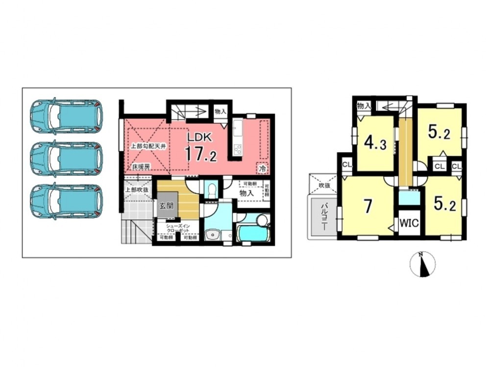 - システムキッチン、食器洗浄乾燥機、浴室乾燥機、モニタ付インターホン、ウォークインクローゼット、複層ガラス、駐車場3台分、シューズインクローク/浄水器