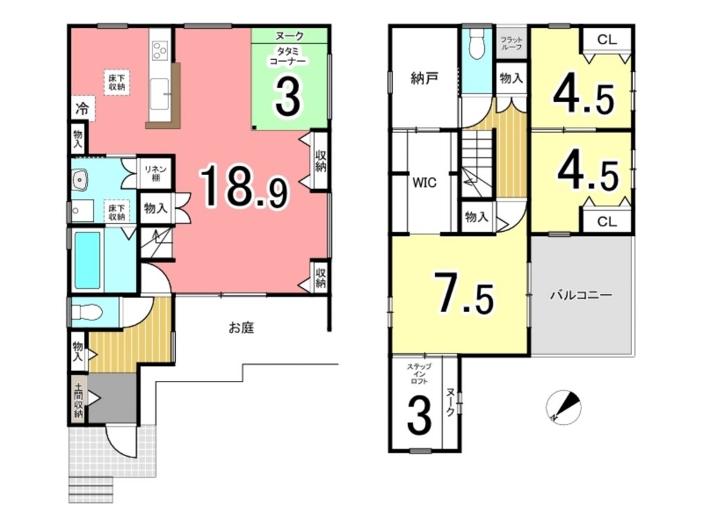 - ウォークインクローゼット、複層ガラス、駐車場2台分、トイレ2箇所、畳コーナー
